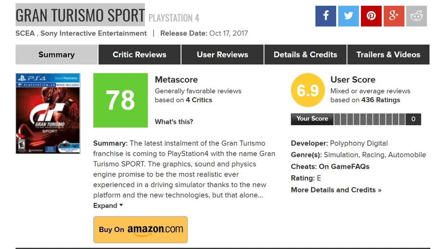 Долгожданная GT Sport оказалась полным провалом. Средний балл на Метакритике составляет 78 и продолжает снижаться. Критики жалуются на скудный вид и ещё более скудное количество контента. Отмечая, что это по сути лишь пролог к Gran Turismo 7 а не полноценная номерная часть.
