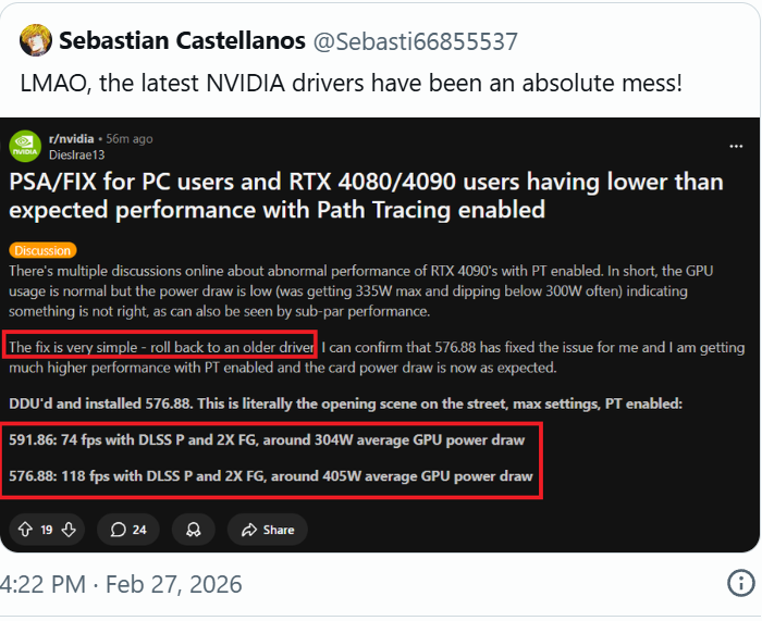 Недавний драйвер Nvidia ( v595.59) был катастрофой с кучей глюков. Пользователи заметили очень сильное падение производительности RTX 4090/5090 в Resident Evil Requiem. Например у одного пользователя фремрейт упал со 133 до 79 фпс! Это очень большое падение: