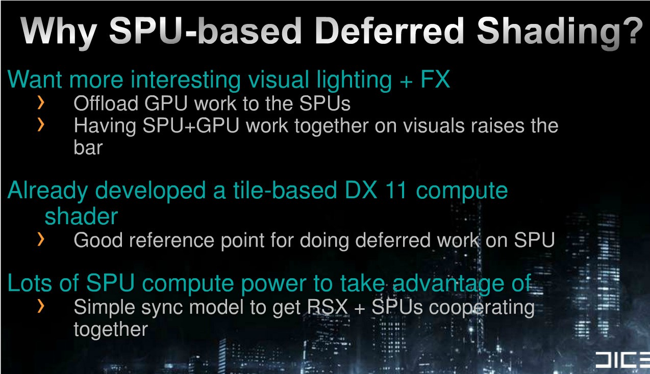 DICE объясняет это тем, что у Xbox360 нет SPU, в то время, как использование онных на PS3 позволит владельцам этой консоли получать более качественную и современную версию, так как в данном случае имеется возможность использовать SPU+GPU вместе и одновременно для того, чтобы поднять планку качества. Это также позволяет разгрузить несколько SPU для того, чтобы работал GPU, предоставляя таким образом им больше места и возможностей для отображение более четких шейдеров и деталей окружения.