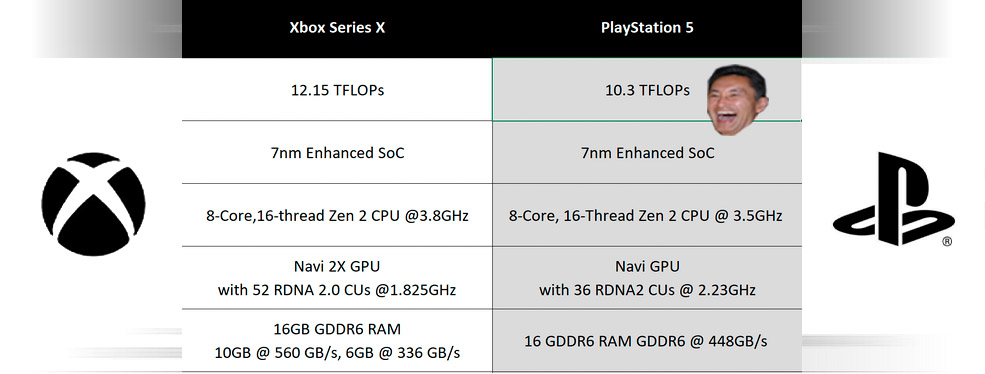 И казалось бы меньше блоков от чего на полтора терафлопса меньше, все это действительно звучит страшно и отнюдь не победоносно, еще эти маркетинговые 5-8Гб в секунду не в тему. Разве так сложно будет подождать дополнительную секунду загрузки, но получить новый уровень графики за счет дополнительных 15 процентов мощности? Пффф, глупые сонибои ![]()