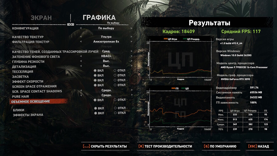 Чтобы подтвердить результаты MadFanboy решил быстро протестировать последний Томб Райдер на RTX 3090 корыте. 4К всё на самое ультра (абсолютно все ползунки вправо) с лучами на ультра. Максимально тяжёлый режим. Напомню, что DLSS 4.5 лучше всего работает с пресетом Производительность и Ультра Производительность, при выборе Качество больше смысла в DLSS4 (в плане производительности). Результаты: