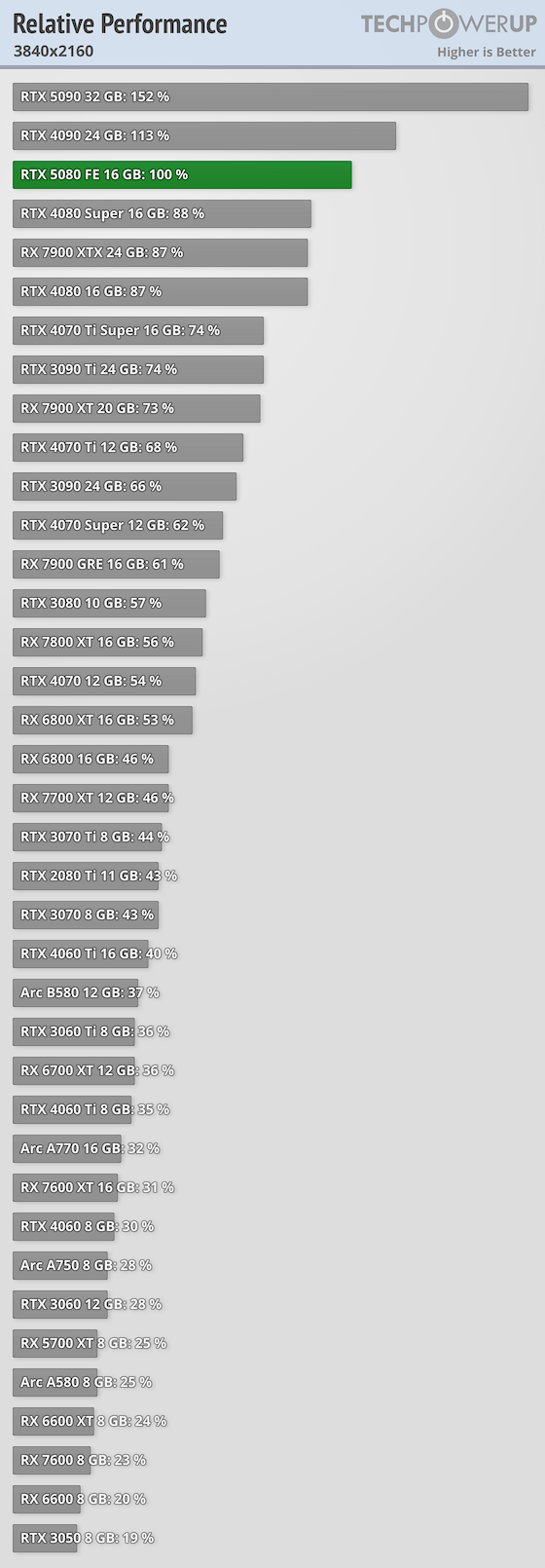 Ну вот и появились первые тесты долгожданной RTX 5080 за 999$. Итак, карта на 5-12% быстрее RTX 4080S в 4К и 1440p и медленнее в 1080p.