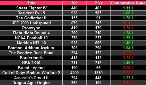 Занятная табличка, показывающая соотношение версий X360 и PS3 игр, которая разбивает в прах миф о том, что игры для PS3 не продаются. Как видите, соотношение игр на количество проданных приставок как правило выше у PS3. Т.е сонифэны покупают больше игр чем их зелёные собратья.