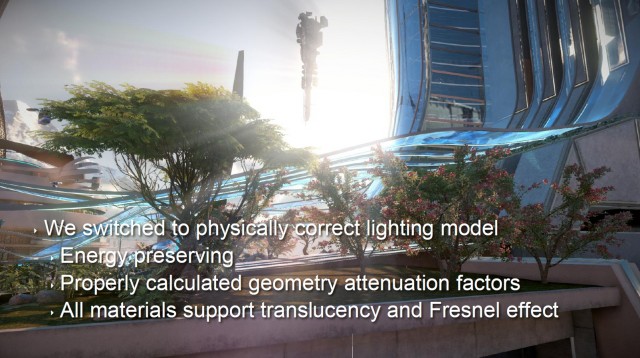 При этом, на сей раз студия решила перейти на геометрическую корректировку модели освещения. Игра просчитывает геометрические факторы ослабления света, а также все материалы в игре поддерживают "полупрозрачность", благодаря которой свет будет струиться сквозь тонкие объекты.