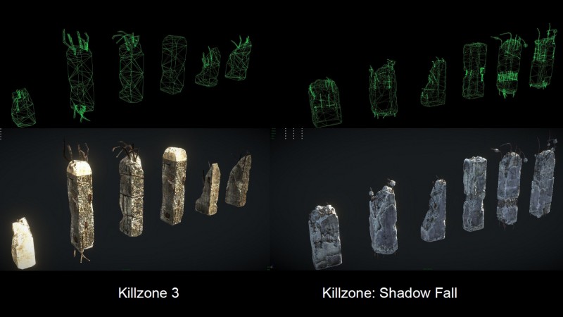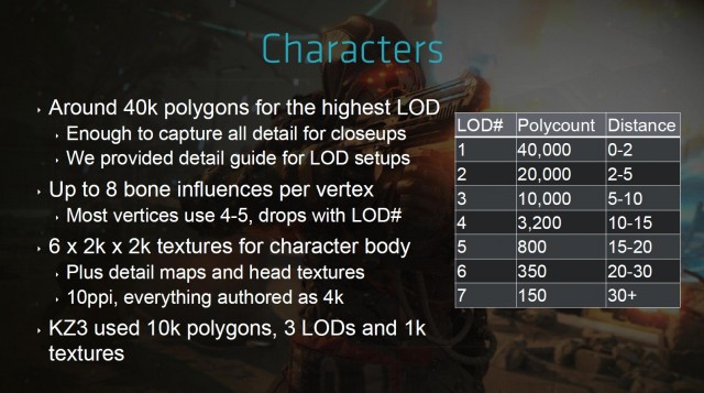 Мы видим, что при просмотре того или иного персонажа вплотную (LOD#1), он прорисовывается при помощи 40 000 полигонов. При удалении от персонажа на определенное расстояние, его прорисовка сначала снижается вдвое (LOD#2 - 20 000 полигонов), а затем и в 4 раза (10 000 полигонов), однако, даже при этом количестве полигонов, при довольно большом удалении от того или иного персонажа, он будет прорисован также, как при самом близком рассмотрении персонажа в Killzone 3, в котором максимально использовалось до 10 000 полигонов, 3 разных системы прорисовки и 1000 текстур. А ведь все помнят насколько реалистичными были персонажи в Killzone 3, которые до сих пор выглядят впечатляюще для каррентгена: