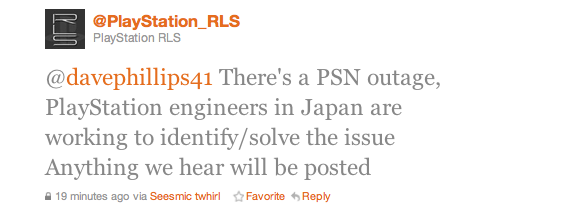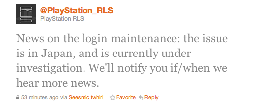По поводу отключения PSN, наши инженеры в Японии уже работают над установлением и решением проблемы. Вся новая информация будет опубликована в этом твиттере.
