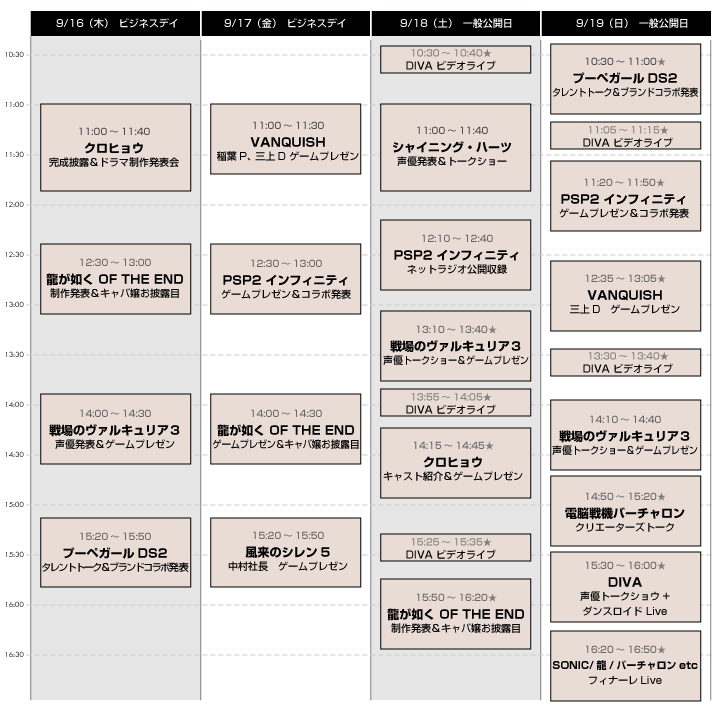 С официального сайта Sega утекла информация о графике проведения TGS 2010. Так что если вы умеете читать по японски, то можете узнать, пройдя по ссылке, что одна из игр - это Valkyria Chronicles 3 триквел к замечательной тактической jRPG с PS3 и PSP.