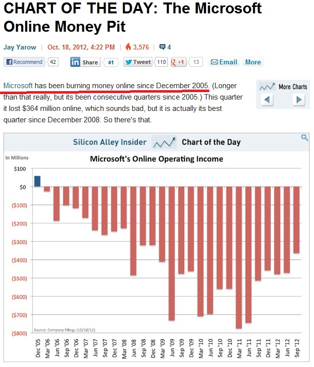 "Microsoft получает почти 75% всего своего дохода от программ Windows и Office, менее чем 25% дохода они получают от своих серверов и различных дополнительных программ. В то время как от продажи Kinect и Xbox360 они не получают ни цента прибыли, но на их развитие и поддержание онлайна тратят уйму денег. Причем мало того, что нет прибыли, так Microsoft еще и в минусе от игрового онлайн подразделения, речь идет о 350-700 миллионных убытках".