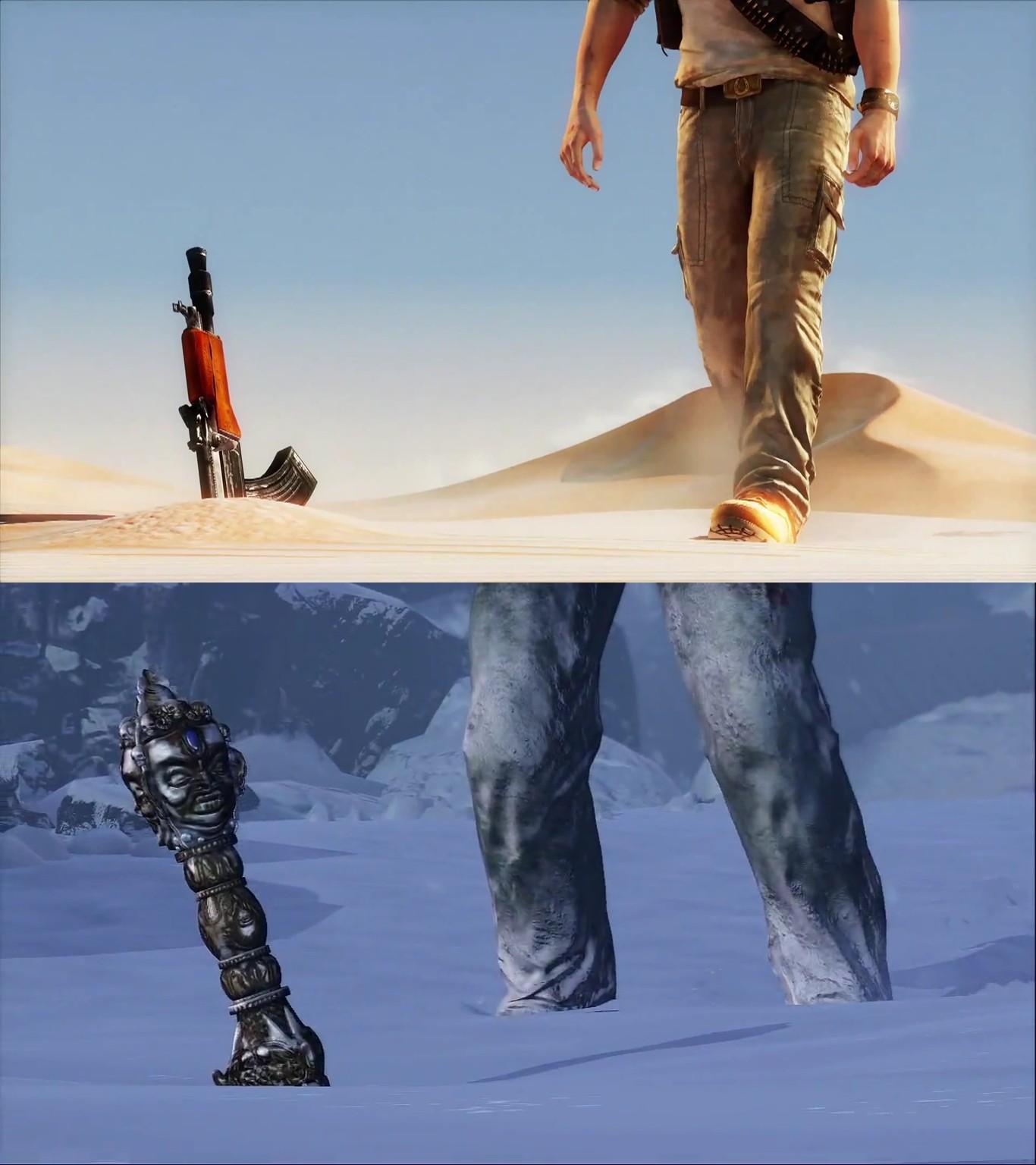 Пока Дрейк двигается вглубь пустыни, то вы ему ничем помочь не сможете, но вы будете приятно удивлены не только эффектами песка, но и дальностью прорисовки, а также особенностями анимации движений, которые соответствуют именно этому уровню и окружающей обстановке в уровне.