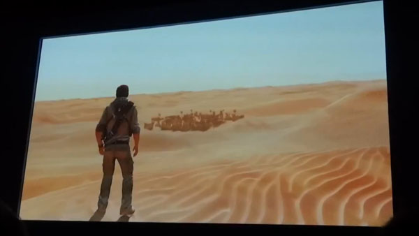 Ричард представил нам совершенно новый геймплей, который ранее никогда не демонстрировали на публике. Ранее часть этого геймплея проскальзывала в самом первом ролике Uncharted 3 и начался он с того, что Дрейк очнулся по среди пустыни неподалеку от упавшего самолета. С каждым новым движение Дрейк страдает от усталости и обезвоживания, и изменения анимации его движений просто потрясающая.