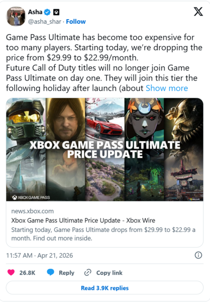 Xbox Game Pass Ultimate стал дешевле, цена упала с $29.99/месяц до $22.99/месяц. И Call of Duty больше не будет выходить на релизе в ГеймПассе. PC Game Pass тоже подешевел - с $16.49 до $13.99.