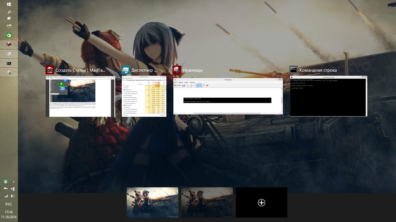 Да, Windows наконец-то приобрела нативную поддержку нескольких рабочих столов - привет от юникс-совместимых систем родом 98-99 годов! 15 чёртовых лет прошло. Пока, конечно, не совсем ясно как перетаскивать те или иные приложения между рабочими столами, но движение в нужном направлении, несомненно, радует. Пусть и такими небольшими шажками.