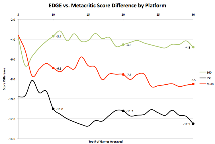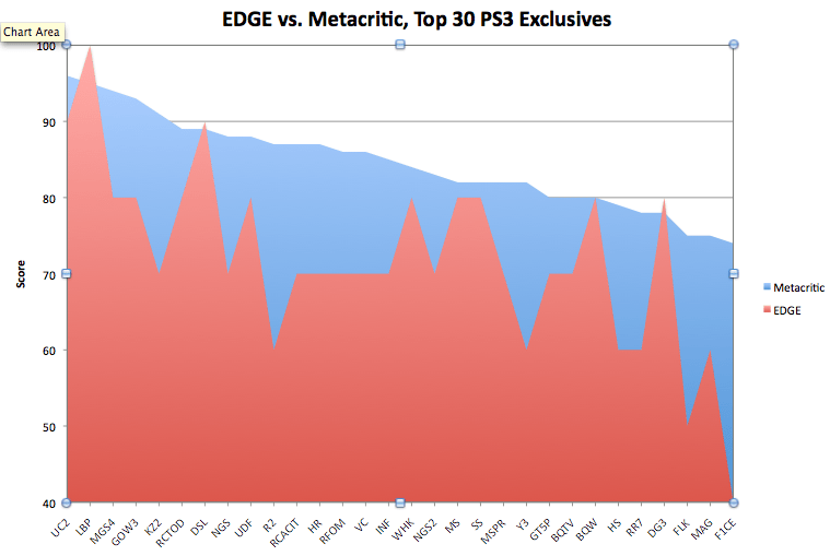 Это график эксклюзивов - PS3 и Xbox 360. Здесь топ 30 эксклюзивов и 30 мультиплатформенных игр. Сравнивают средний балл по EDGE и Metacritics.
